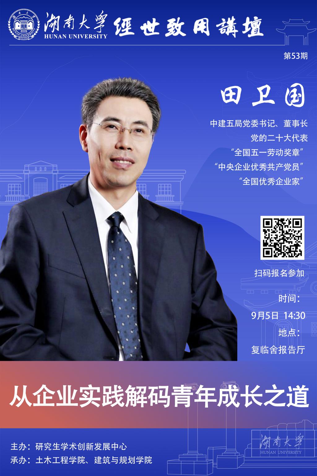 9月5日14:30邀請中建五局黨委書記、董事長、“全國五一勞動獎章”獲得者田衛(wèi)國老師于復臨舍報告廳作“從企業(yè)實踐解碼青年成長之道”主題報告,歡迎同學們前來聽講。參加方式詳見海報,敬請期待!